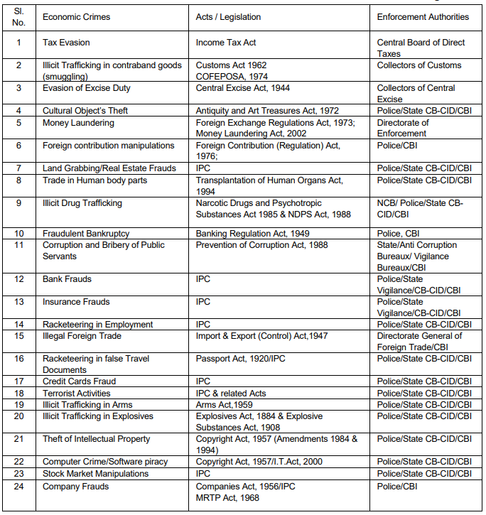 As per the National Crime Records Bureau (NCRB) of Government of India; Economic offences form a separate category of crimes under Criminal offences. These are often referred as White/Blue Collar crimes. People belonging generally to upper economic status are found involved in such crimes with the help of some unscrupulous and corrupt Government functionaries and advanced technology. Economic offences not only inflict pecuniary losses on individuals but also damage the national economy and have security implications as well. The offences of Smuggling of Narcotic substances, Counterfeiting of currency and valuable securities, Financial Scams, Frauds, Money Laundering and Hawala transactions etc. evoke serious concern about their impact on the National Security.